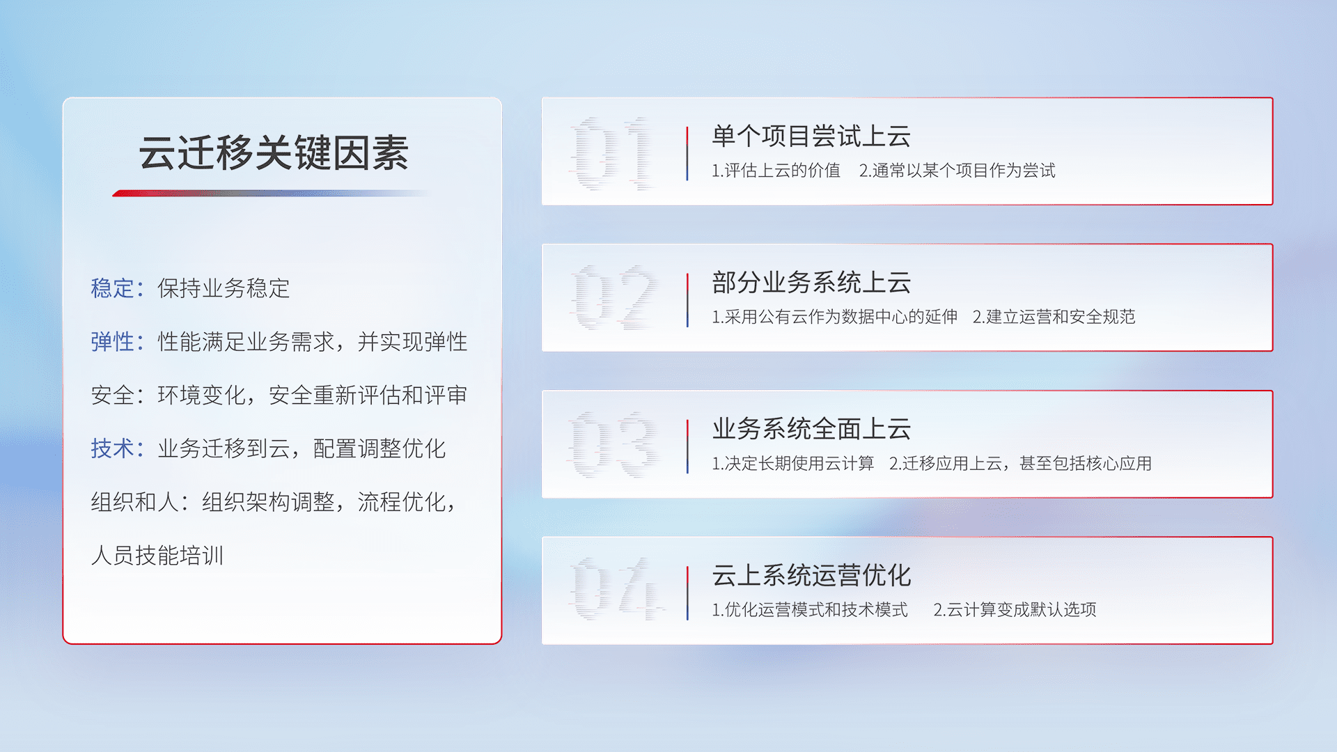 结合实际业务,,,,从规划设计、、、云平台选型、、云原生改造、、、、数据迁移、、、、集成交付,,迁移全过程为客户识别最佳上云路径,,,做好风险识别管理,,,设计网络架构、、、、身份权限、、、安全审计合规、、、、操作审计、、、、日志审计、、、监控告警策略、、、多站点容灾设计等,,,对云上基础设施进行整体规划,,,提升IT治理水平,,以满足弹性、、、高可用、、、、高性能的需求。。。