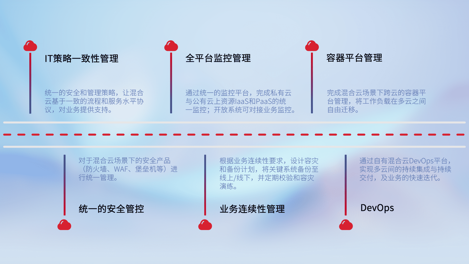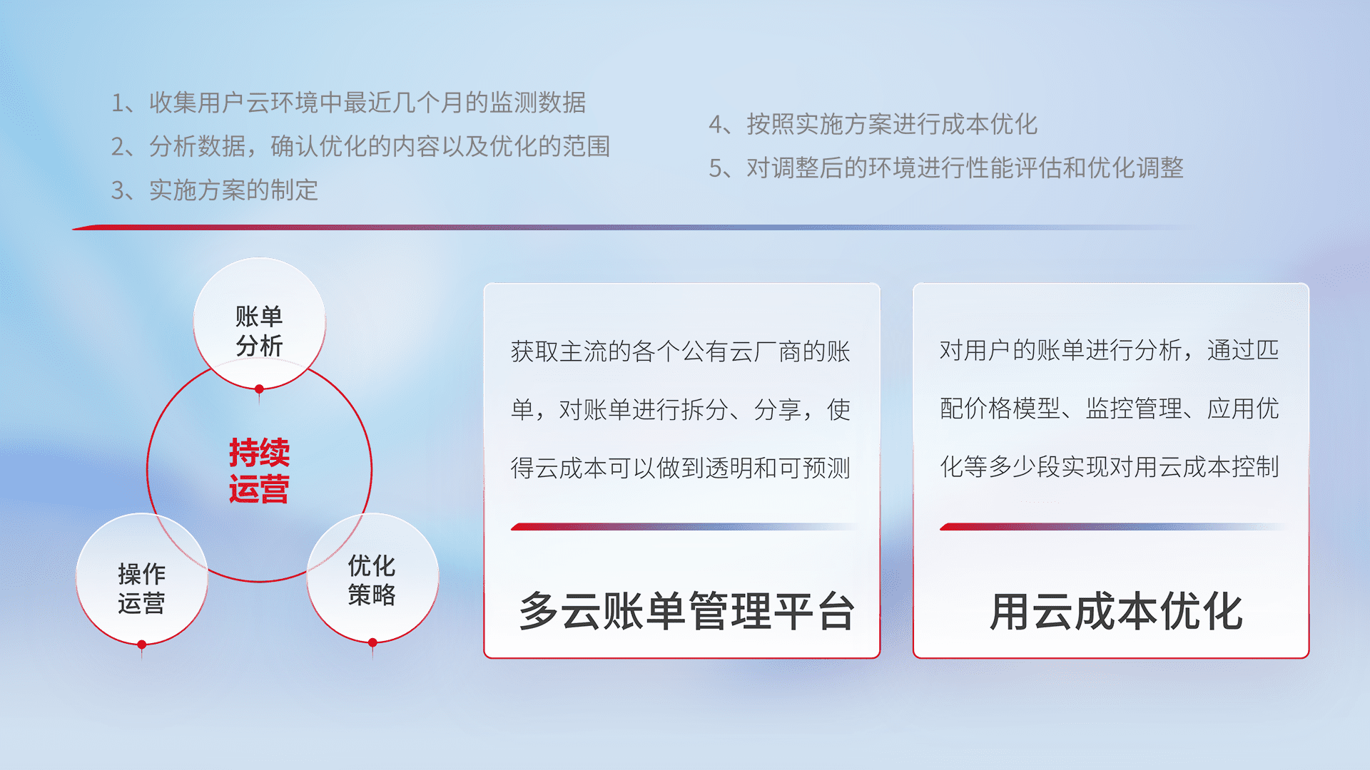 通过多云纳管,,,以统一的资源数据模型把客户的云资源进行抽象和封装,,,进而实现对多云资源的统一操作,,,,保障云资源管理的可靠性、、、稳定性与可用性。。量身定制化运维内容,,,,配置、、开发运维、、、补丁管理、、备份、、、监控、、认证和访问管理、、审计和日常巡检等,,保障在用云过程中的可靠度,,稳定度以及高可用率。。