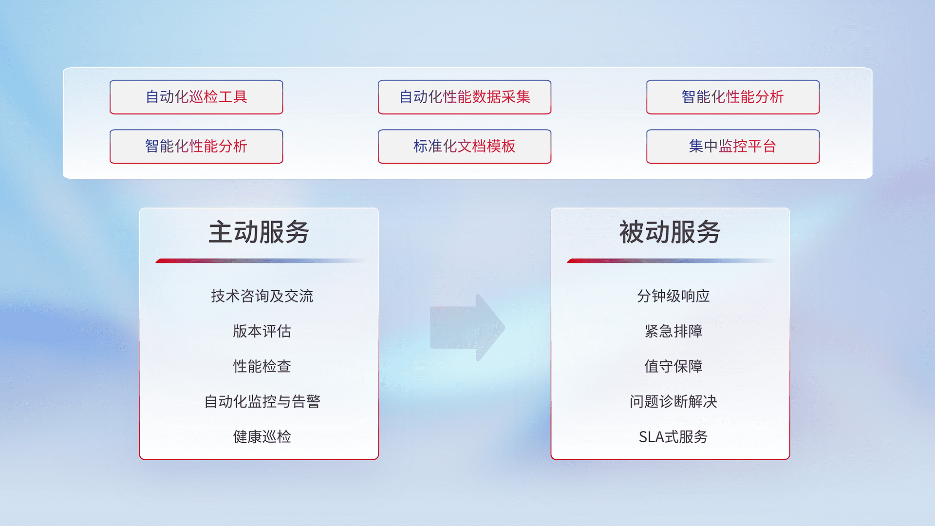 智能化工具和标准化文档,,保障服务质量,,,提供主动服务(包含技术咨询、、版本评估、、、性能检查、、、、自动化监控与告警、、健康巡检)和被动服务包含(分钟级响应、、、、紧急排障、、值守保障、、、问题诊断解决、、、SLA服务)。。